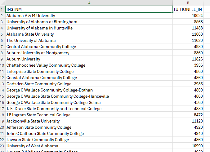 In this tutorial, we will be working with data that is the tuition costs of public universities in 2023. I have a collection of just a bit more than 1600 such universities in the USA. The data looks like this: