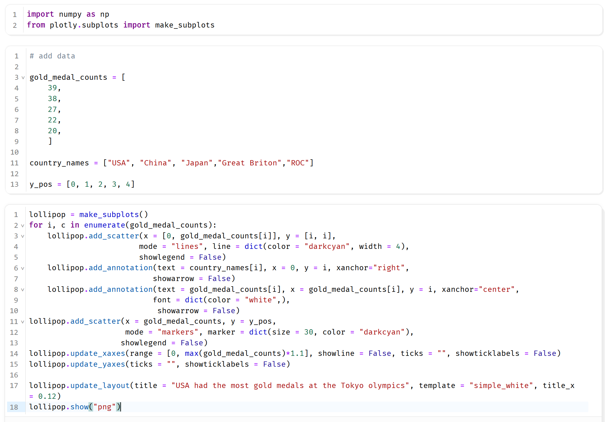 We can implement this as in the code below, where we draw the lines first, so that the lollipop circles are drawn over the top of them. We also specify that we want lines. Another thing we do is to specify the color of the scatter markers and the lines, because otherwise, the colors will change for each line.