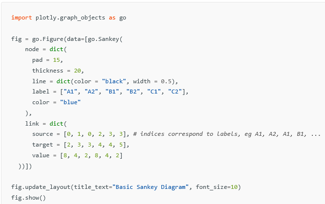 Plotly has a way to directly create a Sankey plot. Thus, we can use Plotly directly. However, we need to learn to read the documentation and understand how to construct the plot. This documentation can be found here