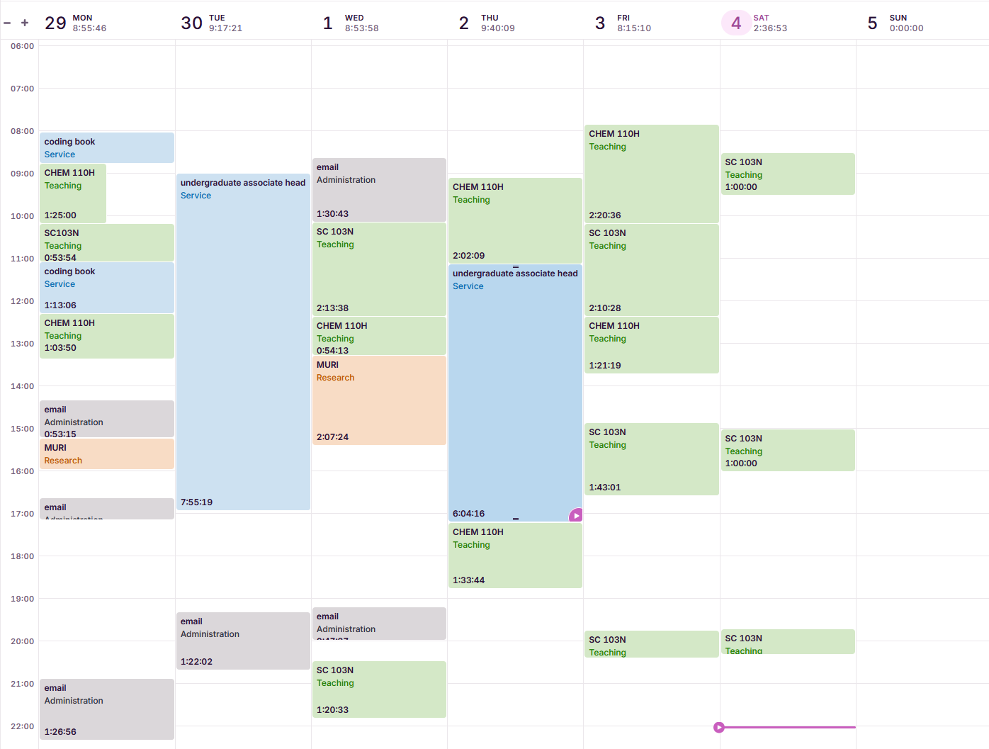 label = ["hours in week", "email", "teaching", "CHEM 110H", "SC 103N", "Research", "Service", "Sleep", "Free time"],